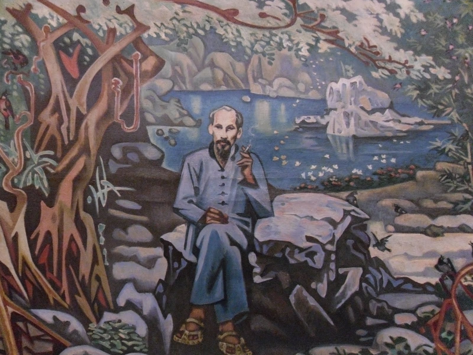 What struck me about Vietnamese SR art is how intimate they appeared. One of my favorites of the bunch was this portrait of Uncle Ho, which shows the leader placidly smoking and sitting amidst a gorgeous Hanoi landscape painted largely in blue. What this painting highlights: the revolutionary leader's accessibility, wisdom, and calm. There's no show of outwardly strength or brute force; there is gentleness, but also strength, the kind that is internalized by the leader and the land. Most depictions of Uncle Ho follow this tradition, whether it be in paintings, photographs, or sculpture. No wonder the Vietnamese love him with so much affection to this day.